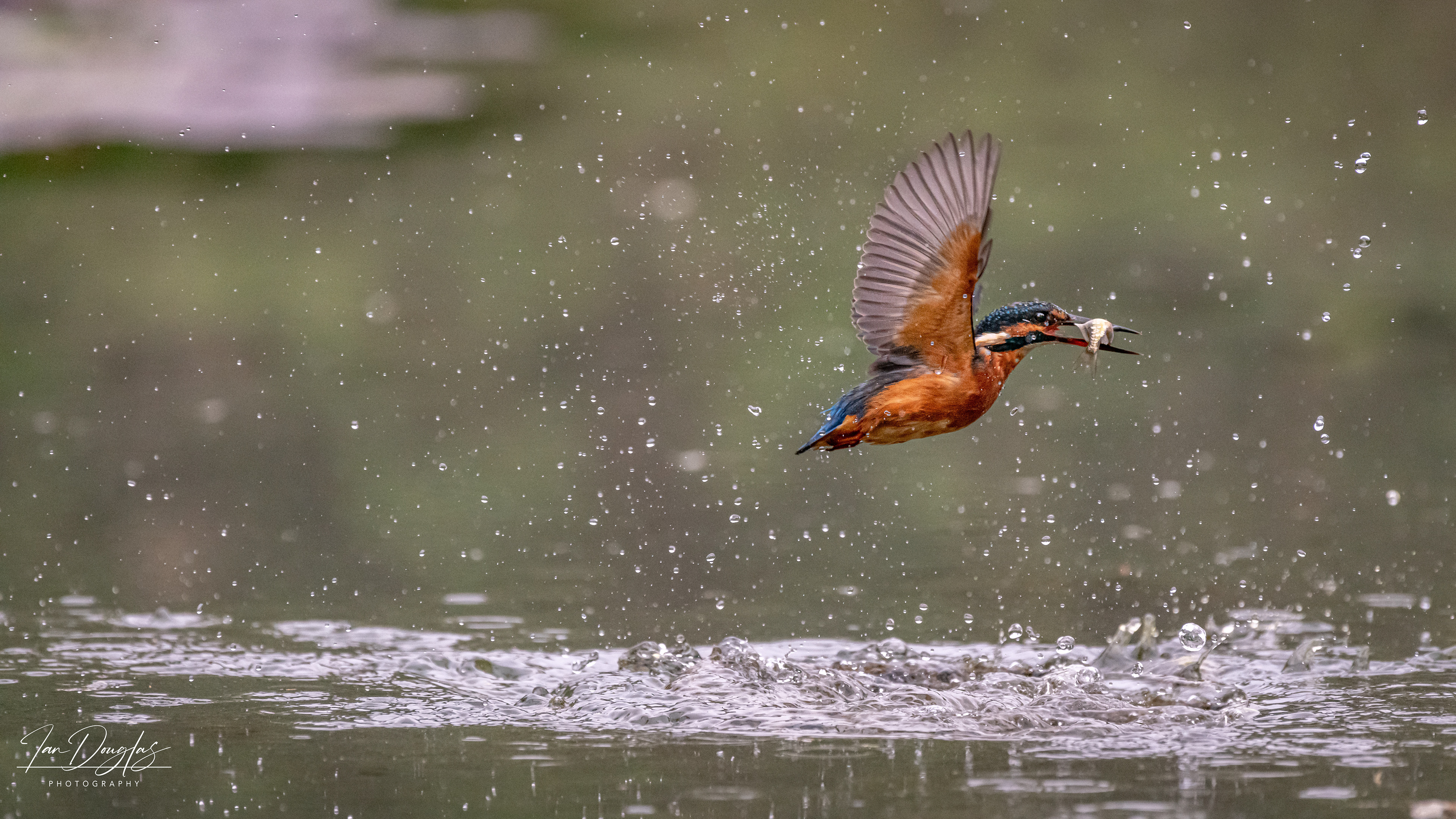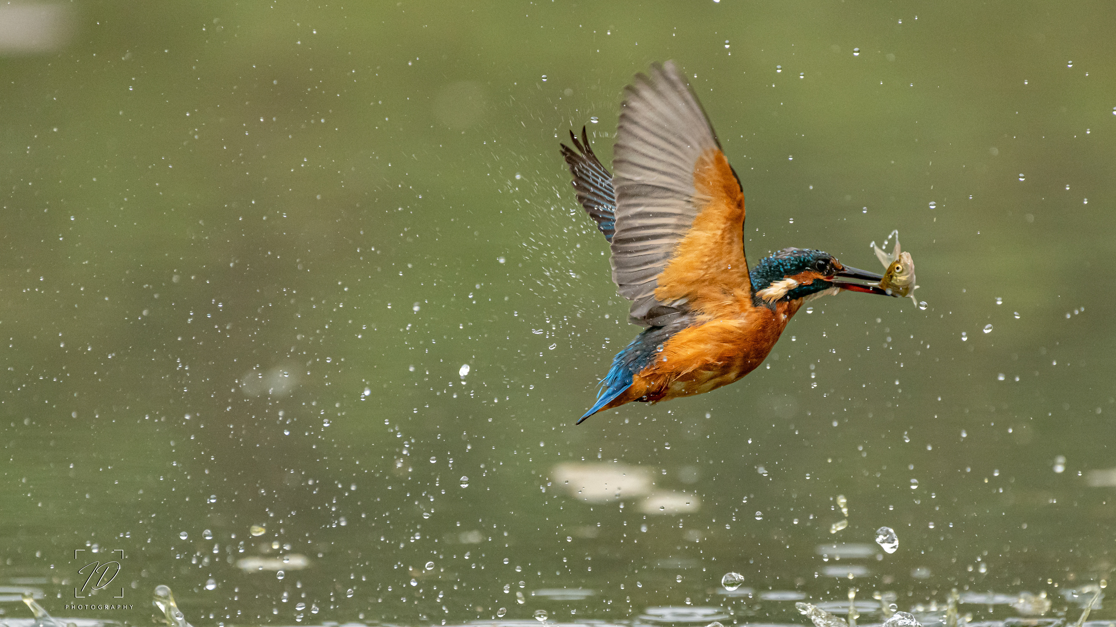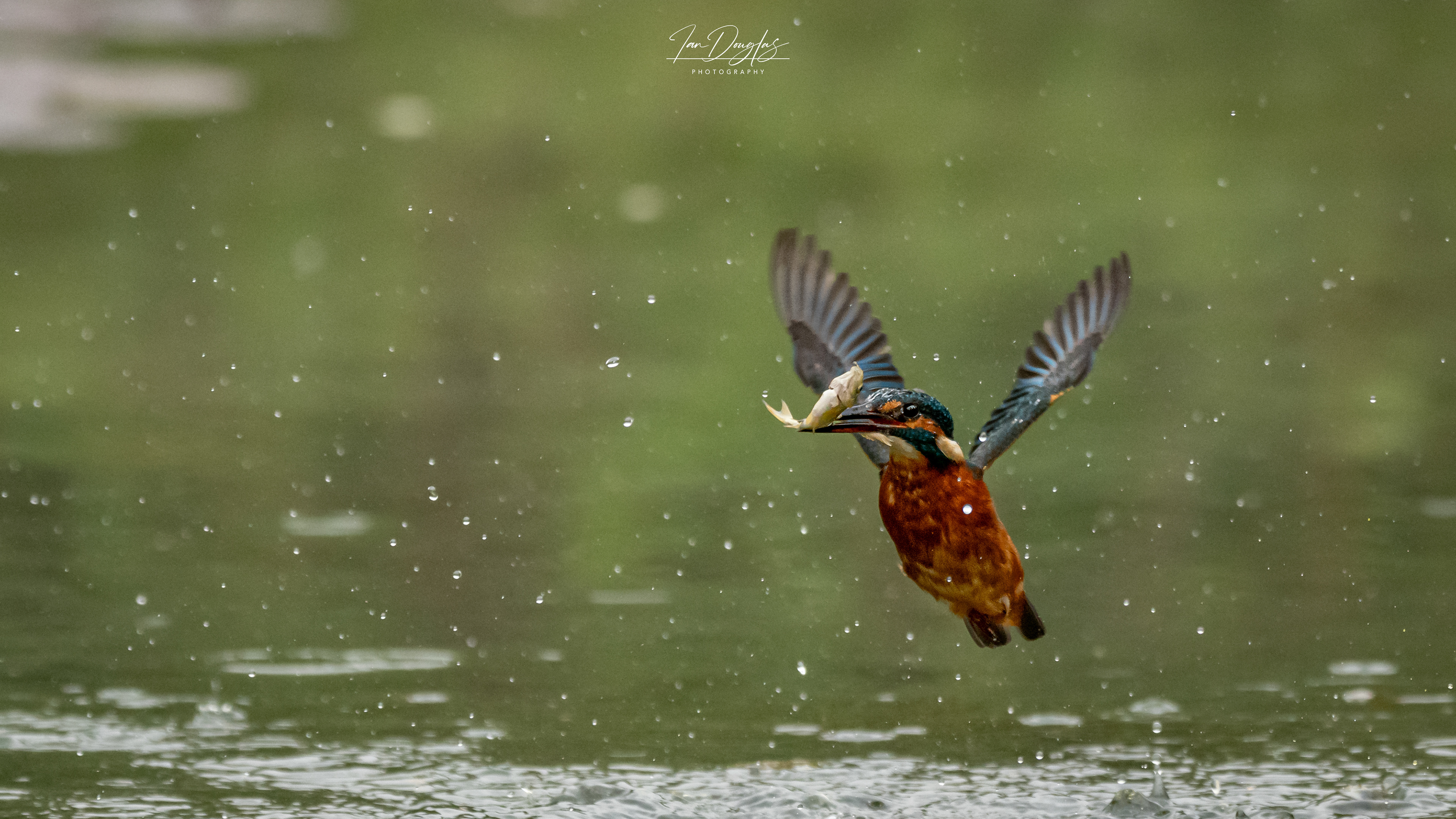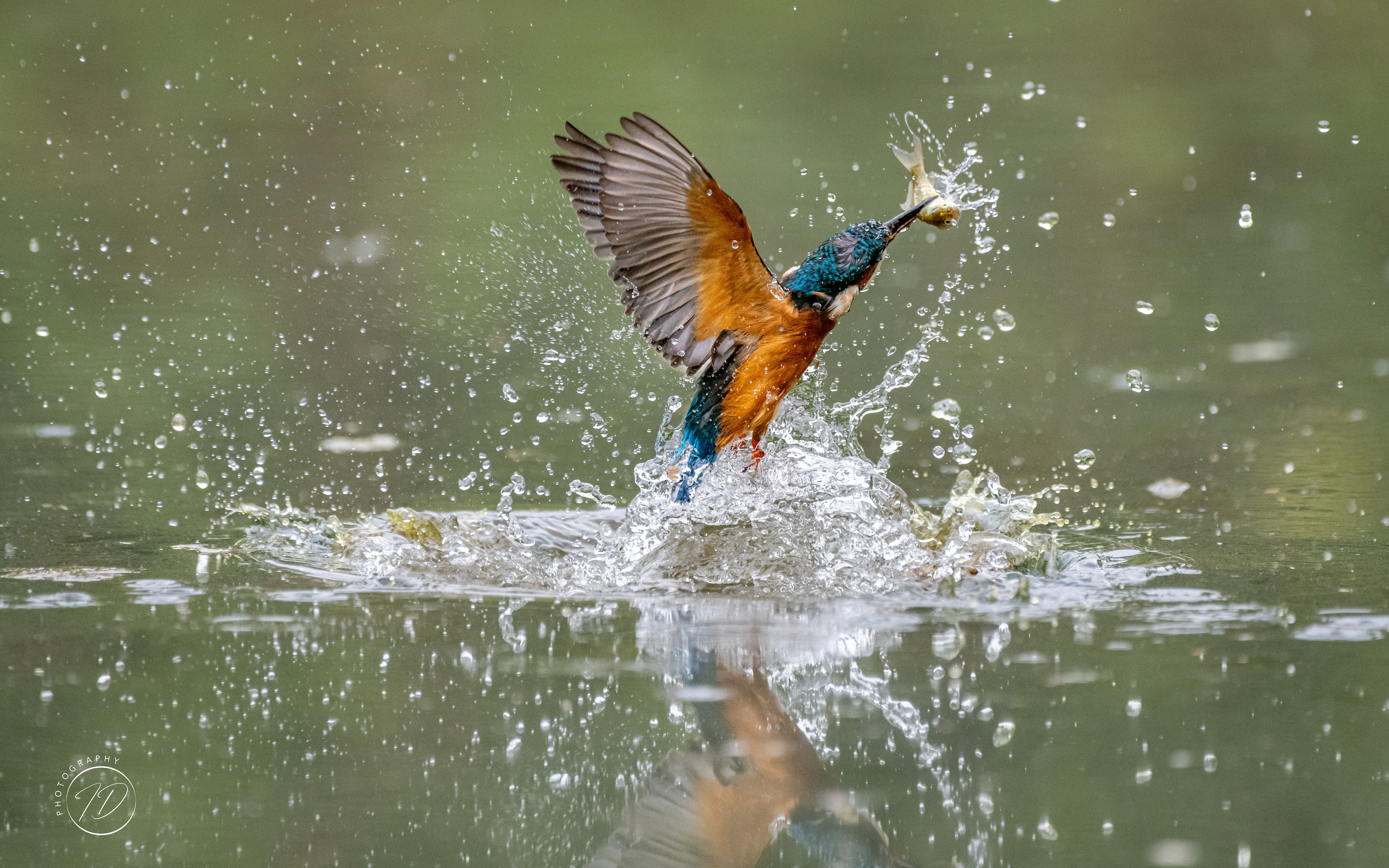 A kingfisher fishing in a large pond in Hampshire